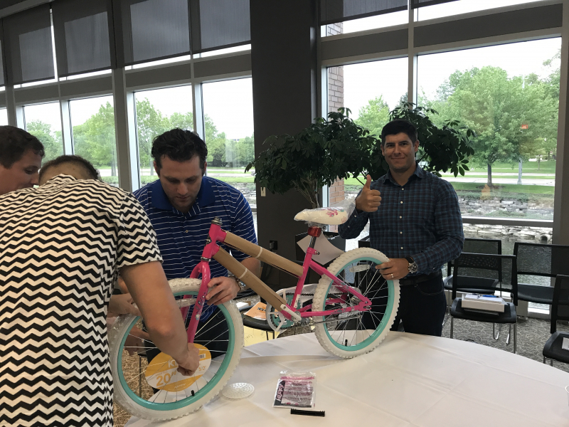 Our participants enjoyed a break from policy forms and pricing during a volunteer event. Six teams competed in a fast-paced team-building exercise to build bikes for the children at the Boys & Girls Club of Naperville.